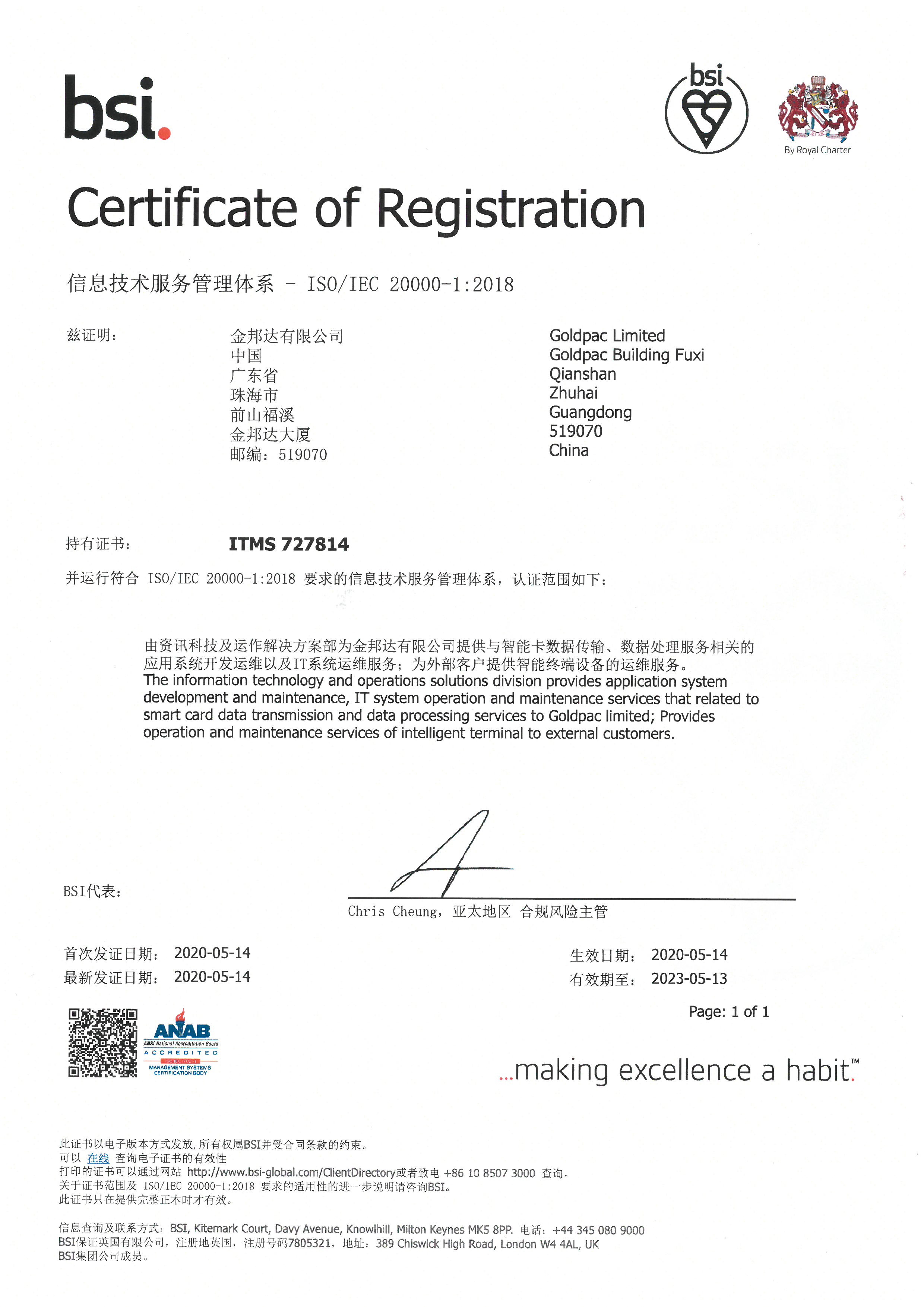 此次通过ISO/IEC20000信息技术服务管理认证,是继通过ISO9001质量管理体系、ISO27001信息安全管理体系、ISO14001环境管理体系、OHSAS18001职业健康安全管理体系认证、知识产权体系认证、两化融合管理体系认证等诸多认证后,金邦达体系认证工作的又一里程碑,不仅扩展了金邦达现有体系认证的范围,更为金邦达在新型智能终端领域信息科技管理工作和风险防范水平的进一步提升奠定了坚实基础,为公司持续经营、稳健发展提供了有力保障。