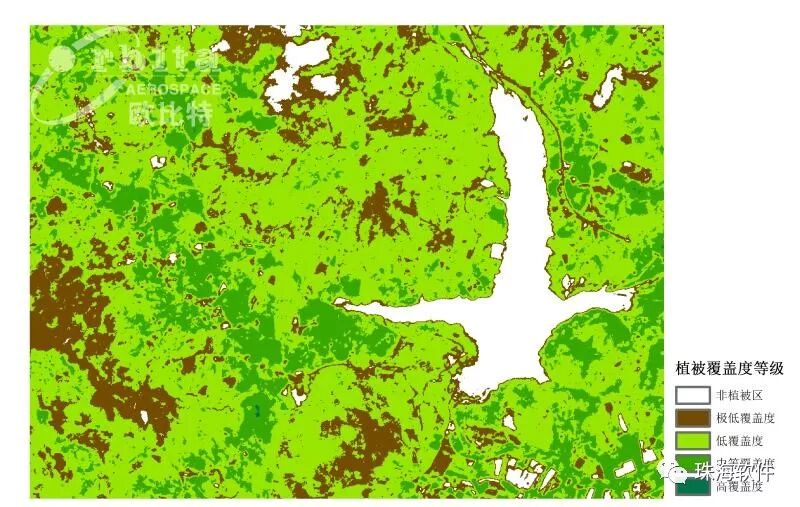 上图是利用近红外波段828nm和红色波段678nm运算得到植被指数生成的植被覆盖分布图,利用这种光谱波段信息分析技术可广泛应用于林业监测、城市环境监测、生态环境监测等领域。